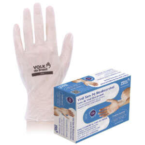 Luva para procedimentos não cirúrgicos confeccionada em vinil, sem pulverização de pó bioabsorvível/amido, ambidestra, superfície externa lisa, não estéril.